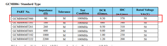 谷景對應GCMH06系列貼片共模電感的參數:90Ω的阻抗、370mA的額定電流、0.3Ω的直流電阻。